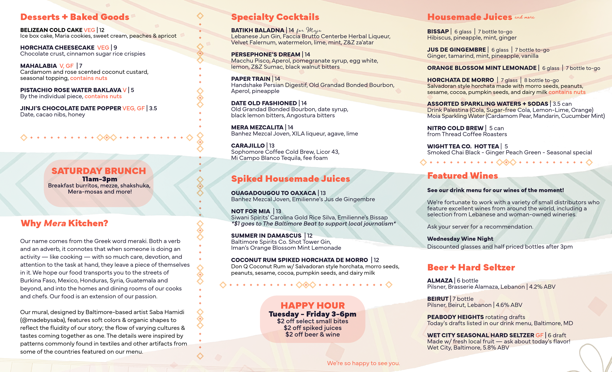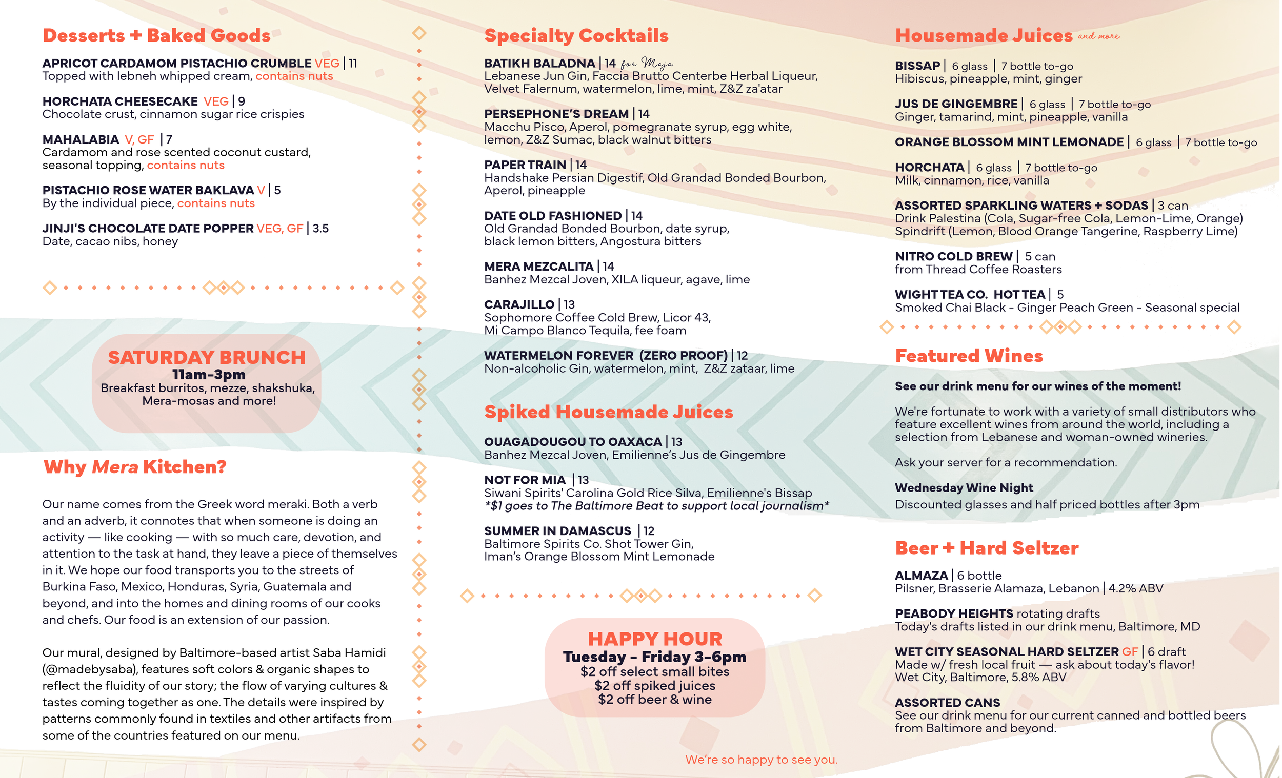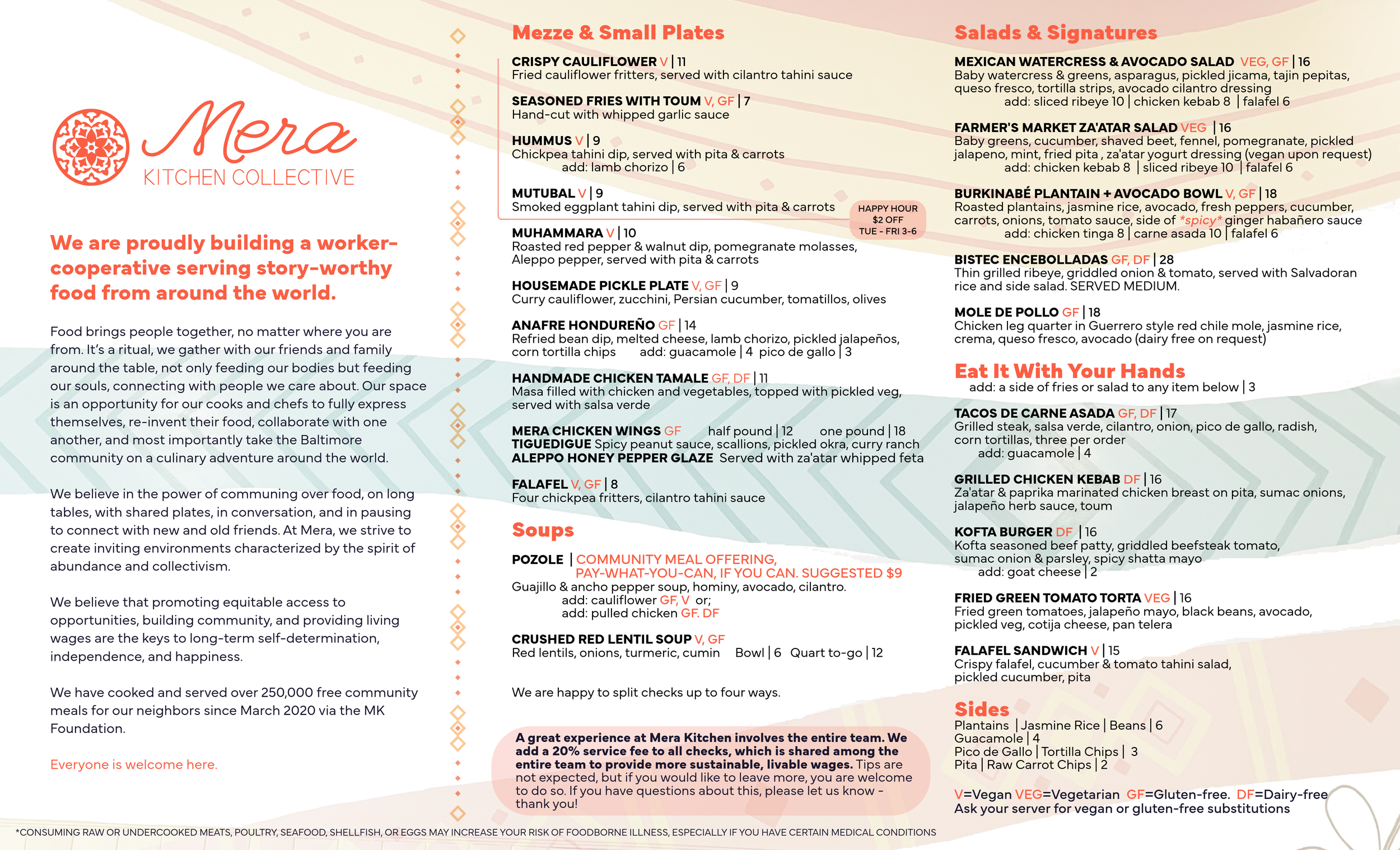 A great experience at Mera Kitchen involves the entire team. We add a 20% service fee to all checks, which is shared among the entire team to provide more sustainable, livable wages. Tips are not expected, but if you would like to leave more, you are welcome to do so.